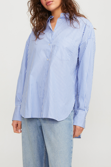A poplin striped shirt with drop shoulders. - Relaxed fit - 70% organic cotton, 30% cotton - Rounded, slight high-low hem - Left chest patch pocke...