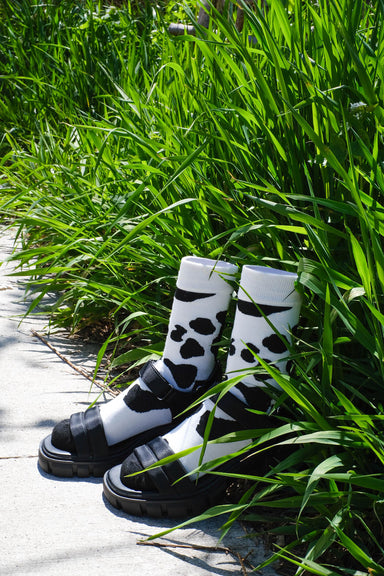 Crew socks with all-over cow print. - One size fits most (women’s 6-10) - 100% cotton - Wash warm, tumble dry low - Imported