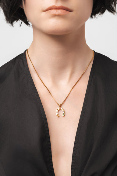 A lucky horse shoe charm with faux gems and gold tone finish. - 21”L- 1” charm- Hypo-allergenic- Imported