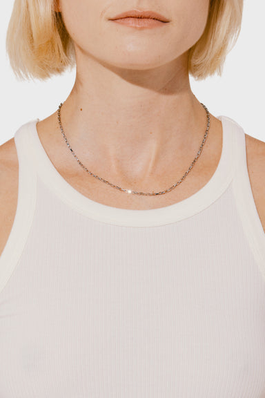 A thin chain with rectangular links. - 20” chain - 2mm width - Stainless steel base - Hypo-allergenic - Lobster clasp closure - Imported