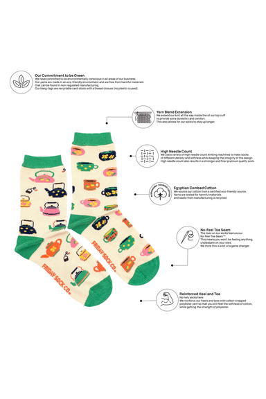Celebrate your love of tea! - Fits women's US sizes 5-10- 85% Egyptian Combed Cotton 12% Nylon 3% Spandex- Designed in Canada,- Ethically made in I...
